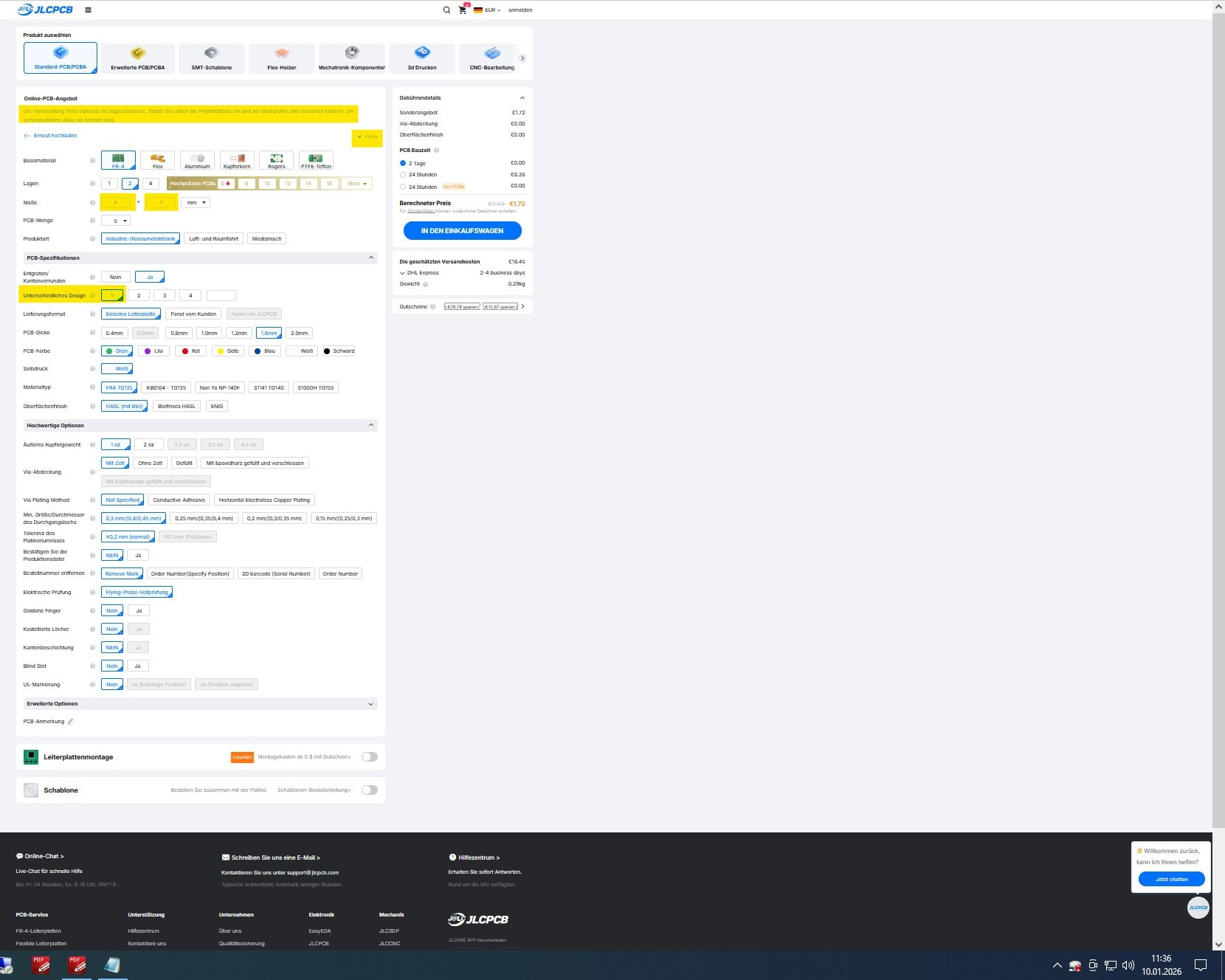 Es erscheint zwar die Meldung: Datei erfolgreich hochgeladen, aber scheinbar erkennt jlcpcb die Datei nicht korrekt, denn dadurch fehlen dann z. B. in den Produktdetails die Platinenabmessungen usw. und deshalb kann ich auch nichts in den Warenkorb übertragen, fehlen hier irgendwelche Daten in den Gerber-Dateien?